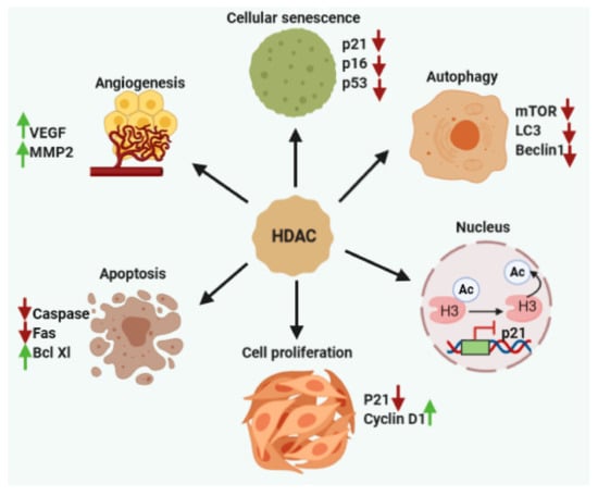 HDACs help in the progression of cancer cell growth and spreading via regulating cell proliferation, angiogenesis, apoptosis, metastasis, autophagy, and senescence.