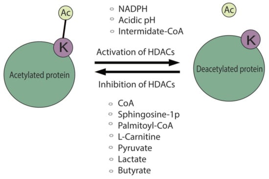 Several metabolites, produced from various intracellular biochemical reactions, may directly control HDAC activities (Figure 3). The cellular activity of recombinant HDAC1 and HDAC2 complexes were found to be increased with the addition of NADPH and CoA-derivates []. In particular, molecules generated from the glycolysis and/or involved in the fatty acid and sterol biosynthesis, including acetyl-CoA, butyryl-CoA, isobutyryl-CoA, succinyl-CoA, malonyl-CoA, methylmalonyl-CoA, and methylcrotonyl-CoA, may increase HDAC activity. In contrast, HDAC1 and HDAC2 activities were inhibited by the long chain fatty acid derivatives such as palmitoyl-CoA and the free CoA []. Further studies on the role of metabolic regulation in HDAC activity were observed by a bioactive lipid sphingosine-1 phosphate, formed during nuclear sphingolipid metabolism involved in β-oxidation of fatty acid, which could inhibit HDAC activity by binding to its active site [,].