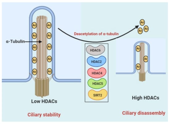 HDAC6 is known to inhibit ciliary assembly in CCA cells via deacetylating the tubulin protein in the ciliary axoneme [,]. Previously, we reported that HDAC6 expression was noticed as being upregulated in CCA cells [] due to a dysregulation of miRNA-433 and miRNA-22, which induces the expression of HDAC6, consequently prompting ciliary loss and cell growth in normal cholangiocytes []. Interestingly, exposure to cigarette smoke induced HDAC6-mediated deacetylase activity, which led to autophagy-mediated cilia shortening in epithelial cells of mouse models []. Additionally, in pancreatic ductal adenocarcinoma cells, HDAC2 has been reported as a regulator of primary cilium formation, which reduces the expression of Aurora A kinase and thereby stimulates disassembly of primary cilia []. In zebrafish, HDAC4 and HDAC5 modulate cilia formation during kidney morphogenesis []. In another study in zebrafish, decreased cilia numbers and uncharacteristic centrosome amplification and polyploidy were observed with overexpression of SIRT2 in Kupffer’s vesicle. Reduction of SIRT2 inhibited the irregular amplification of centrosome and polyploidy associated with loss of polycystin-1 (PC1) [] (Figure 4).