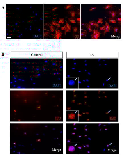 Zebrafish MCs can spontaneously repair and regenerate their retinas, but those of mammals cannot. For this to happen, mammalian MCs must first be able to proliferate and increase their repair and regenerative abilities exponentially. Therefore, we investigated the optimal ES conditions for improving glial cell proliferation in vitro. MCs were isolated as previously described [27,34]. Proliferation was assessed using the EdU incorporation assay [29]; the MC purity was calculated to be ~95% as reported, and as confirmed by counting the cells immunolabeled positive for the MC marker, glutamine synthetase (GS) (Figure 1A).