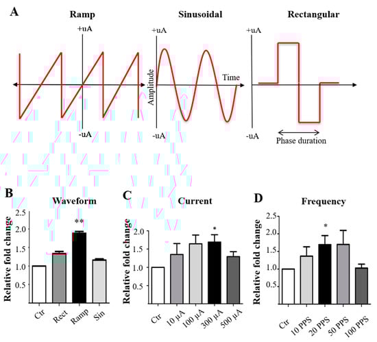 MCs were treated with low-current electricity with a rectangular waveform at different frequencies, phase durations, and current amplitudes. The rectangular waveform was initially selected because it is most commonly used in all reported animal and clinical studies and is most consistent with the natural electrical signal of neurons. MCs were initially stimulated for 1 h with standard 100 µA, a rectangular waveform, at 1 ms/phase duration and 10–100 PPS. We found that 10 and 20 PPS marginally upregulated MC proliferation by ~1.2-fold (Supplementary Materials Figure S1A). Second, we explored the optimal phase duration by varying between 0.5 and 5.0 ms/phase under 20 PPS, 100 µA, and a rectangular waveform. While ES of 1 ms/phase duration tended to lead to the highest number of proliferating MCs, we detected no significant differences among groups with various phase durations (Supplementary Materials Figure S1B). Third, we investigated the optimal current amplitudes by varying between 10 and 500 µA under 20 PPS, 1 ms/phase duration, and a rectangular waveform. We found that 300 µA yielded optimal MC proliferation (Supplementary Materials Figure S1C), but no statistical significance was detected at this timepoint. The data suggest that a rectangular waveform may not be as optimal for stimulating MC as has been shown to benefit retinal ganglion cells [34].