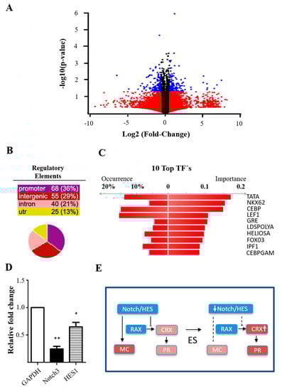 ES-induced transcription factor (TF) changes in cultured MC. (A) Volcano plot of differentially expressed genes (DEGs) results between ES- and control-treated MC groups. The y-axis corresponds to the p-value showing at −log10 of the paired t-test; the x-axis shows the fold change calculated at log2 value. The red dots represent the genes with expression changes <1.5-fold; the blue dots represent genes with expression change >1.5-fold and FDR and p < 0.05. (B) Summary of regulatory elements (REs) detected by distant regulatory elements (DiRE) analysis, which is represented relative to the input genes and categorized as promoter, intronic, intergenic, or UTR elements. (C) Graphical representation of candidate RE scores to the list of most important TFs. The “occurrence” represents the fraction of putative REs that contain a particular TF binding site, and the “importance” is defined as the product of the TF occurrence and its weight. (D) Results of qPCR confirming the significant downregulation of Notch3 and Hes1, 48 h after ES in purified MC cultures (* p < 0.05 and ** p < 0.01, compared to the controls by paired t-test; n = 4/group). (E) Schematic illustration of the notch/HES signaling on MC fate determination.