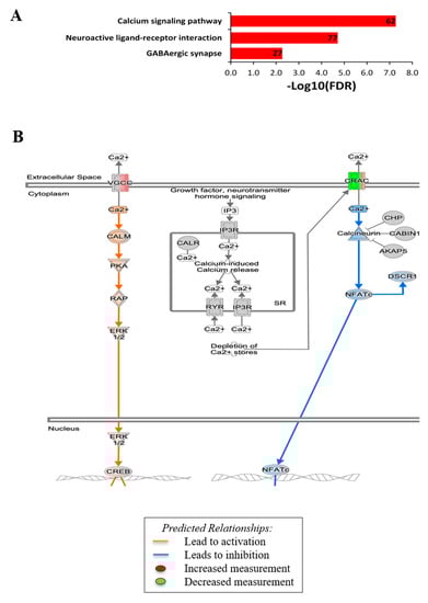 To study the biological pathways and gene networks activated by the ES, we employed KEGG analysis. This linked ES treatment to the calcium signaling and synaptic activities. KEGG analysis revealed prominent upregulation of the calcium signaling pathway (FC > 1.5, FDR = 5.33 × 10−8 (p = 1.78 × 10−10) (Figure 4A)) and the voltage-gated calcium channels, the pathway of which acts directly or indirectly to mediate cell growth and development. Among the 62 of 183 genes involved in the calcium signaling cascades, a total of 28 genes, including Camk2b (calcium/calmodulin-dependent protein kinase II beta) and Ptk2b (protein tyrosine kinase 2 beta), which are important for synaptic formation and neuroplasticity, were upregulated. The MAPK–ERK (mitogen-activated kinase–extracellular signal-regulated kinase) pathway that is crucial for cellular proliferation, development, and differentiation, was upregulated (Figure 4B), consistent with the observed MC proliferation post-ES. As the calcium signaling pathway was clearly over-represented, several synaptic signaling pathways, such as the glutamatergic and GABAergic signaling pathways, were also over-represented in the ES-treated samples (Figure 4A), with FC > 1.5, in comparison to the reference Mus musculus genome glutamatergic synapses (FDR = 9.84 × 10−5; p = 9.87 × 10−7) and GABAergic synapses (FDR = 0.00533, p = 0.000179). These changes support that ES induces membrane depolarization, likely involving voltage-gated channel activation and leading to Ca2+ influx and sensitization for certain neurotransmitters and synaptic signaling. An overarching look at ES-activated signaling events suggests that ES confers MC with predictively increased cell growth capacity (e.g., MAPK/ERK and CREB), while it weakly predicted inhibition of NFATc (nuclear factor of activated T cells 1) or the immune/inflammatory pathways (Figure 4B). This altered MC genetic landscape likely provides them with higher plasticity and progenitor cell/neurogenic potential.