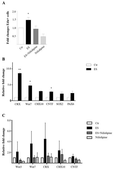 Essential involvement of calcium for ES-induced MC proliferation. (A) Improved MC proliferation after ES and the loss of this effect in the presence of 1 µM nifedipine (* p < 0.05, paired t-test). (B) Results of qPCR showing upregulation of progenitor cell markers and the neurotrophic factor Cntf in cultured MC at 48 h after ES with ** p < 0.005 and * p < 0.05 compared to sham treated control with paired t-test. (C) Nifedipine blocked ES-induced upregulation of progenitor markers such as Wnt3, Wnt7, Crx, and Chx10 in cultured MC.