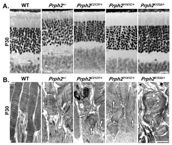 Another mutation in PRPH2 that leads to variable phenotypes among patients is the deletion of codon 153 (K153Δ) that results in the elimination of the lysine at position 153 in the D2 loop of Prph2. This mutation is found to associate with RP, pattern dystrophy and fundus flavimaculatus [80]. K153Δ-Prph2 knockin mouse model was generated and provided evidence that the mutant protein cannot form the complexes required for OS formation [79]. The heterozygous knockin mice (Prph2K153Δ/+) displayed a shortened OS with minor structural defects at P30 [79] (Figure 1). At P180, these animals also exhibited a reduction in ONL thickness without further structural deterioration of the OS [79]. The overall Prph2 protein level in these mice was around 80% compared to the level in WT mice, thus demonstrating that the observed structural defects are most likely caused by the dominant effect of the mutant protein rather than due to haploinsufficiency.