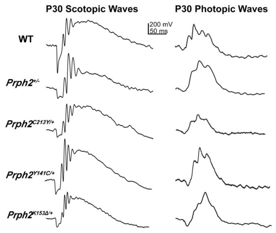 Mutations in Prph2 hinder OS function assessed via scotopic and photopic electroretinograms (ERGs) at P30. Full-field ERGs were recorded under scotopic and photopic conditions. Shown are representative ERG waveforms from the indicated genotypes at P30. Full-field ERG tests were performed as previously described [85]. After overnight dark adaptation, mice were anesthetized and their pupils dilated. ERGs were recorded with a UTAS system (LKC, Gaithersburg, MD, USA). Waveforms were exported into GraphPad software to obtain wave traces and then exported into Photoshop using a uniform scale.