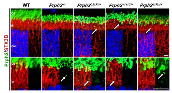 A key requirement for the function of Prph2 is its ability to interact with Rom1 and to form oligomeric complexes [18,27,74]. Co-immunoprecipitation (co-IP) experiments using retinal lysate from Prph2C213Y/C213Y mice revealed the inability of Prph2C213Y to interact with Rom1. The homomeric interaction of Prph2 was also reduced in these mice as evident from reduced ability of Prph2C213Y to form intermediate and higher order complexes as determined by sucrose gradient velocity sedimentation [76]. The reduction in oligomeric complexes offers an explanation for the functional decline observed in both Prph2C213Y/+ and Prph2C213Y/C213Y mice and no abnormal high molecular weight aggregates were observed under non-reducing conditions. Prph2C213Y/+ retina retains some Prph2 in the IS, shown by immunofluorescence (IF) staining of Prph2 (green and arrows in Figure 3) and IS maker syntaxin 3B (STX3B) (red, Figure 3). However, Prph2C213Y/C213Y lacks the ability to form complexes which leads to complete retention of Prph2 in the inner segments (IS), and perinuclear region while a smaller amount of Rom1 was retained in the IS [76].