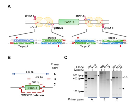 For DNA extraction, cells from the individual clones were washed with PBS, collected by scraping, lysed in 100 μL ice-cold lysis buffer (40 mM Tris-HCl, 2 mM EDTA, 0.08% SDS, 80 mM NaCl, 0.5 μg/μL Proteinase K) and incubated overnight at 37 °C in agitation. To precipitate DNA, 100 µL of ice-cold 2-propanol and 0.3 M NaAc were added, samples were mixed and centrifuged at 13,000 rpm for 30 min at 4 °C. The pellet was washed with 150 μL of 70% ethanol, centrifuged at 13,000 rpm for 30 min at 4 °C. Supernatant was discarded, the pellet was dried and resuspended in 30 μL H2O. The resulting DNAs were then screened for positive exon 3 deletion by PCR.