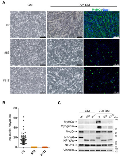 - Basile, V.; Baruffaldi, F.; Dolfini, D.; Belluti, S.; Benatti, P.; Ricci, L.; Artusi, V.; Tagliafico, E.; Mantovani, R.; Molinari, S.; et al. NF-YA splice variants have different roles on muscle differentiation. Biochim. et Biophys. Acta (BBA) - Gene Regul. Mech. 2016, 1859, 627–638. [Google Scholar] [CrossRef]