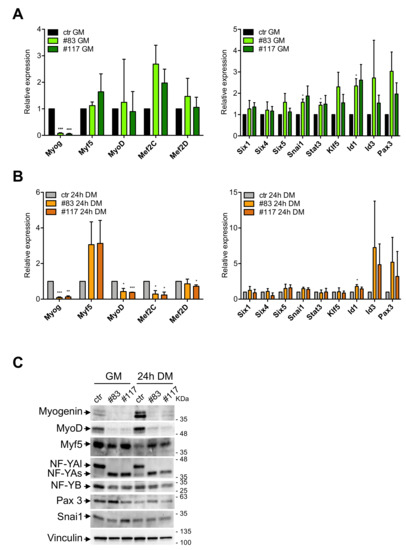 Cell specification and differentiation during development of multicellular organisms is a complex set of events resulting in the formation of organs, whose physiology is maintained by a balance of cell proliferation and differentiation. A paradigmatic example of these phenomena is formation of skeletal muscle. In the case of mammals—mouse in particular—the process begins at early developmental stages, proceeding through embryonic, fetal and adult stages [1,2]. Sequence-specific transcription factors—TFs—play a central role in specifying the identities of myoblasts, their migration to different body locations, organization and the capacity to self-renew and differentiate into myotubes. These properties are key to guarantee maintenance and functionality of the different muscles throughout the lifespan of the organism, including repair after injury in adult life. A set of four key TFs —MyoD, Myf5, Myogenin, MRF4, termed myogenic regulatory factors (MRFs)—have been identified and thoroughly studied by genetic and biochemical means for their capacity to specify myoblasts identity [3,4]. During development, PAX3/7 are located upstream of MRFs [5]; downstream are many TFs, such as the MADS box MEF2A/C/D [6,7], the bHLH ID1/3 [8,9,10] and SNAI1 [11], the HOX SIX1/4/5 [12,13,14,15], STAT3 [16], NFIX [17,18] and the ZNF KLF2/4/5 [19,20]. Unlike MRFs, most of these TFs are not expressed predominantly in muscle cells and are equally important for development and differentiation of other tissues and organs [21,22,23,24,25].