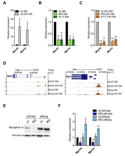 Myogenin overexpression was performed by electroporating 1 × 106 C2C12 cells with 3 µg of plasmid (pEMSV-Empty/pEMSV-Myog) and plating them in DM for 96 h. Cells were then collected and analyzed. Three independent biological replicates were performed.
