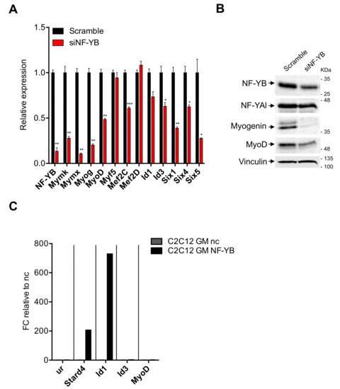 For small interfering RNA (siRNA)-mediated knockdown of NF-YB [29], 2 × 106 C2C12 cells were transfected by electroporation with 100 nM of NF-YB [29] or scrambled control siRNA (Qiagen, SI01327193) and plated into a 10 cm plate in GM condition. 72 h after transfection, cells were collected by scraping for total protein preparation and RNA extraction. Gene expression was analyzed performing real-time PCR. Two independent biological replicates of siRNA interference were performed.