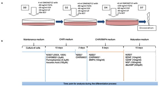 Cells were plated at a density of 12.103 cells/cm2 in precoated poly-l-ornithine (15 µg/mL; Sigma-Aldrich, Saint-Louis, MO, USA, P3655)/laminin (1 µg/mL; Sigma-Aldrich, Saint-Louis, MO, USA, L2020)/fibronectin (50 µg/mL; Corning, NY, USA, 356008) dishes. They were expanded in the SKP maintenance medium, as previously described (Figure 1A), for a few days to reach 60% to 80% confluence before induction. To initiate differentiation into SNs, the SKP maintenance medium was replaced with DMEM/F12/Neurobasal 1/1/2 (Gibco, Thermo Fisher Scientific, Waltham, MA, USA, 21103-049) that contained B27 100X (without vitamin A), N2 200X (Gibco, Thermo Fisher Scientific, Waltham, MA, USA, 17502-048), 3 µM CHIR99021 (Sigma-Aldrich, Saint-Louis, MO, USA, SML1046), 0.5 µM PMA (Sigma-Aldrich, Saint-Louis, MO, USA, SML0868), and 150 µM ascorbic acid (Sigma-Aldrich, Saint-Louis, MO, USA, PHR1008). This medium was changed every day for 10 days. Then, for 2 days, PMA and ascorbic acid were removed (CHIR medium) from the medium. Following this differentiation into SNs, 10 ng/mL BMP4 (Sigma-Aldrich, Saint-Louis, MO, USA, SRP3016) was added to the medium already containing N2B27 and CHIR99021 (CHIR/BMP4 medium) for 8 days. For maturation of SNs, the medium that was used was composed of neurotrophic factors: 100 ng/mL NGF, 10 ng/mL GDNF, 10 ng/mL BDNF, and 500 µM dibutyryl cyclic AMP (dbcAMP; Sigma-Aldrich, Saint-Louis, MO, USA, D0260) (Maturation medium). This medium was changed every 2 days for 15 days. This part of the protocol is shown in Figure 1B.
