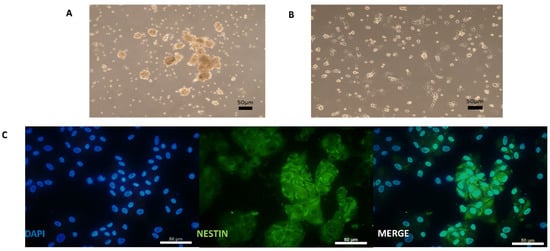 Cultured human SKPs under maintenance medium with uncoated support. A—Picture of SKPs in neurospheres before adherence. B—Picture of SKPs after adherence. C—Immunocytochemistry analysis of SKPs with NESTIN (Protein of neural progenitor markers). Scale bars = 50 µm.