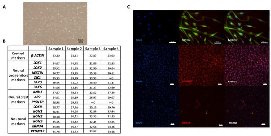 These cells expressed NESTIN (Figure 2C). Before differentiation induction on a coated plate, the SKP cells were examined for the expression of markers of neural progenitor cells, neural crest cells, and SNs to establish a baseline characterization. As indicated in Figure 2C and Figure 3C, the cells were positive for the neural progenitor markers NESTIN and P75NTR but not BRN3A, which is a sensory neuronal marker. Different genes specifically expressed only in a stem cell state and not in differentiated cells were screened to characterize the undifferentiated SKPs isolated from the different patients (Figure 3B). Their phenotype was determined by examining genes corresponding to different stages in the development of NCSCs. In this study, we considered that cycle thresholds (Ct) greater than 36 showed an insufficient amount or absence of the gene of interest. For example, the expression of neuronal markers was very weak or not detectable, with Ct values greater than 36, in the patient SKP cultures prior to the initiation of the differentiation protocol. All studied samples globally expressed SOX9 in premigratory or migratory neural crest-derived cells. These cells also expressed AP2, another neural crest progenitor marker. P75NTR was expressed in two samples and not expressed in two other samples (Figure 3B,C). The expression of HNK1, another marker of NCSCs, was low or absent in undifferentiated SKP populations. In summary, (Figure 3B), SKP populations from different patients displayed variability in gene expression. The results from immunostaining and RT-qPCR confirmed that these cells contained a mixed population of neural progenitors and neural crest (Figure 3B,C).