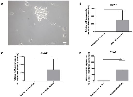 Induction of differentiation into neurons regulated by Neurogenins. A—Picture of differentiated SKPs into neuron-like cells after the maturation step using phase-contrast microscopy. B, C, and D—Results obtained with RT-qPCR and normalized by the control (Maintenance medium). The differential of Neurogenins (NGN) 1, 2, and 3 are analyzed between SKPs in maintenance medium and differentiated SKPs in maturation medium. Graphic represent the mean +/− SEM, * p < 0,05. Scale bar = 100 µm, n = 4.