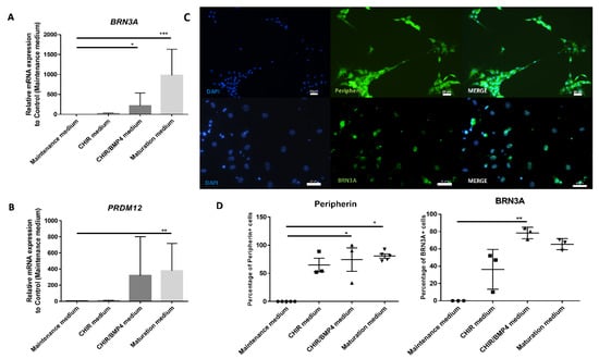 Induction of the expression of SN markers. Temporal gene expression analysis comparing each step of the differentiation process: (A) BRN3A and (B) PRDM12. C and D: Picture of immunocytochemistry (C) and analysis comparing the percentage of PERIPHERIN- and BRN3A-positive cells between SKPs in maintenance medium and each step of differentiation (D). Graphic represents the mean +/− SEM. * p < 0.05; ** p < 0.005; *** p < 0.0005, n = 6 for RT-qPCR and n = 3 for immunocytochemistry (n = 5 for control and maturation medium of peripherin). Scale bar = 20 µm for PERIPHERIN and 50 µm for BRN3A.