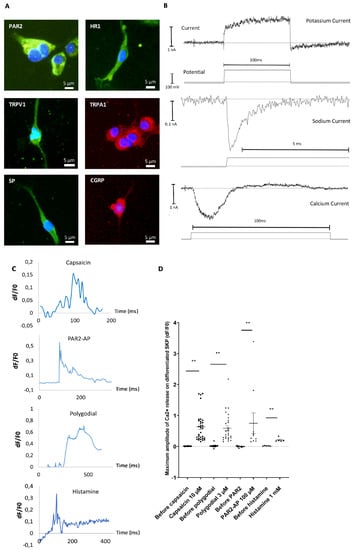To investigate the functionality of cells obtained after differentiation, we analyzed some major receptors and neuropeptides implicated in inflammation, pruritus, or pain. Immunocytofluorescence confirmed the expression of substance P (SP), calcitonin gene-related peptide (CGRP), histamine receptor 1 (HR1), transient receptor potential ankyrin (TRPA1), transient receptor potential vanilloid (TRPV1) and protease-activated receptor 2 (PAR2) (Figure 6A).