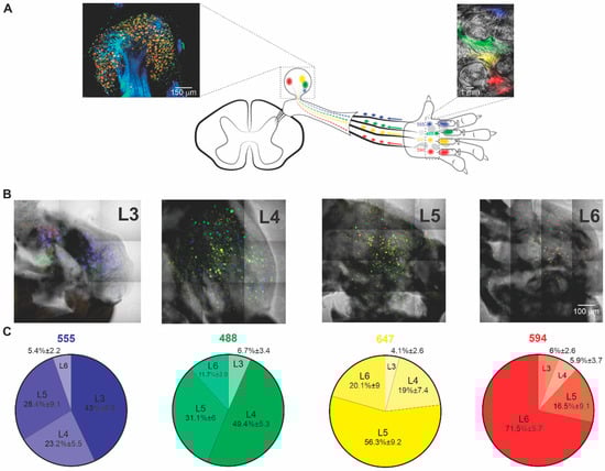 For all of the following experiments, the injection of the fluorophores that were conjugated to WGA remained consistent: blue, AF555 dye was injected into the centro-medial area of the paw (Figure 1A), which is mainly innervated by the saphenous nerve [7,8,14]. Green AF488 and yellow AF647 dyes were injected into the centro-median area of the paw (Figure 1A), being mainly innervated by the tibial nerve [7,8,14] and red AF594 dye was injected into the centro-lateral areas (Figure 1A), which are mainly innervated by the sural nerve [7,8,14]. The calculation of the number of cells labeled with a specific dye throughout the examined DRG segments shows that AF555 was mainly found in L3 DRG (43 ± 9.9% of all labeled cells in L3 were labeled with AF555, n = 5 rats, Figure 1B,C). AF488 and AF647 were mainly found in L4 and L5 segments, respectively (49.4 ± 5.5% of all labeled cells in L4 were labeled with AF488, 56.34 ± 9.2% of all labeled cells in L5 were labeled with AF647, n = 5 rats, Figure 1B,C). AF594 was predominantly found in L6 DRG (71.5 ± 5.7%, n = 5 rats, Figure 1B,C). These results show that Painbow accurately captures the relation between skin areas and the innervation segment.
