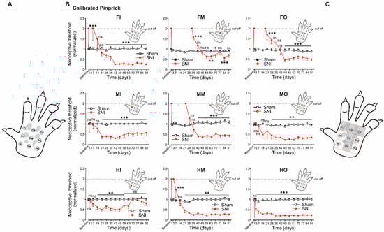 Mapping of the paw reveals differences in the time kinetics of denervation, reinnervation, and development of mechanical hyperalgesia following spared nerve injury (SNI). (A) Scheme of the paw depicting the nine subareas, in which nociceptive mechanical threshold was obtained, using calibrated pinprick (see Materials and Methods). The examined areas are proximal medial (HeelIn, HI), proximal middle (HeelM, HM) and proximal lateral (HeelOut, HO); median medial (MIn, MI), median middle (MM) and median lateral (MOut, MO); distal medial (FingersIn, FI), distal middle (FingersM, FM) and distal lateral (FingersOut, FO). (B) Changes in the nociceptive threshold measured using calibrated pinprick at the indicated time points after SNI (red circles) and sham surgery (white squares) at each of the examined areas (shown in A). Each subpanel demonstrates the changes in the nociceptive threshold measured in one of the subareas shown in A. The subpanels are organized and labeled according to the examined area (abbreviations and a red dot on the inset). *** p < 0.001; ** p < 0.01; * p < 0.05; ns—not significant, n = 6 rats in each group, RM two-way ANOVA). The baseline value represents the mean value of the three tests performed at three consecutive days before SNI or sham surgery. All of the values were normalized to the baseline value. If animals did not respond to the stimulus higher than 2× baseline value (120 gr, cut off), the area was considered to be denervated. Note that some areas became denervated after SNI, and all areas developed pain hypersensitivity. Note also that the duration of denervation and the onset of pain hypersensitivity vary among the nine areas. (C) Schematic representation of denervated areas after SNI. Note, the T-shaped areas which include the middle part of the paw as well as the distal areas closed to the fingers.