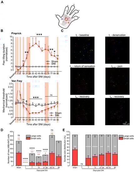 During the development of neuropathic pain symptoms, the skin is reinnervated by a lower number of neurons and primarily by non-nociceptive neurons. (A) Scheme depicting the area (red circle) to which calibrated pinprick and von Frey (VF) were applied to examine the responsiveness of the rats to noxious and innocuous mechanical stimuli, respectively. Note that the chosen area represents the part of the paw skin, which underwent denervation. (B) Changes of the response to pinprick (upper panel) and VF (lower panel) at the indicated times following sham surgery (white squares) and SNI surgery (red circles). The baseline value represents the mean value of the 3 tests performed at three consecutive days before SNI or sham surgery. All of the values were normalized to the baseline value. *** p < 0.001; ** p < 0.01; * p < 0.05; ns—not significant, n = 6 rats in each group, RM two-way ANOVA). Pink vertical areas outline the times at which some of the animals were pulled out of the experiments, and their paws were injected with the AF dyes. These times correspond to the following stages: 1 day after SNI - denervation stage - where no animals responded to the cut off value of the VF (2 X baseline value), and no animals responded to pinprick; seven days after SNI—recovery of sensation in half of the examined animals; 14 days after SNI—return to baseline (recovery of the sensation in all animals); 21–28 days after SNI—development of hyperalgesia and allodynia; 63–70 days after SNI—decrease in hyperalgesia and allodynia; 90 days after SNI—full recovery from hyperalgesia and allodynia. (C) Representative (of six rats) fluorescent photomicrographs of L5 DRGs extirpated 40 h after paw injection of dyes at the indicated times after SNI, corresponding to the abovementioned behavioral stages. (D) Changes in the number of L3-6 DRG somata labeled with either AF488 or AF647 (injected into denervated areas) at the denervation stage (day 1 after SNI), recovery of the sensation stage (7 and 14 days after SNI), development of the hyperalgesia and allodynia stage (21–28 days after SNI); decrease in hyperalgesia and allodynia (63–70 days after SNI) and full recovery from hyperalgesia and allodynia (90 days after SNI), plotted against the number of L3-6 DRG somata labeled with either AF488 or AF647 in animals 90 days after sham surgery. Each bar is composed of the number of small (nociceptive, red) and large (non-nociceptive cells, grey) cells. Comparison is with the number of cells at day 90 after SNI. Black letters and asterisk—comparison between a total number of cells at different time points; red letters and asterisk—comparison between the number of small cells at different time points; grey letters and asterisk—comparison between the number of large cells at different time points. **** p < 0.0001; *** p < 0.001; ** p < 0.01; * p < 0.05; ns—not significant, n = 6 L3-6 DRGs in each group, two-way ANOVA. (E) Bar graph depicting the distribution (in %) of large (grey) and small (red) L3-6 DRG neurons labeled with AF488 or AF647 at the indicated time points and plotted against the L3-6 DRG neurons size distribution from animals 90 days after sham surgery. Comparison is with the number of cells at day 90 after SNI. **** p < 0.0001; ** p < 0.01; ns—not significant, n = 6 L3-6 DRGs in each group, two-way ANOVA, comparisons are between the large and small cells at each time point.