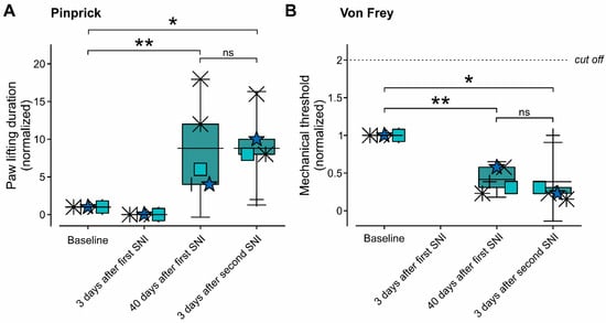 Reinnervation does not originate from lacerated tibial and peroneal nerves but is resulted from sprouting from the axons innervating neighboring areas. (A,B) Box plots and paired individual values of normalized paw lifting latencies, measured using calibrated pinprick (A) and mechanical threshold, measured using VF (B) before SNI surgery (baseline); three and 40 days after the first SNI and three days after repeated SNI. Note no values for the mechanical threshold 3 days after SNI (B) as all animals did not respond to the cut off value of the VF. Note no significant difference between the values of the mechanical threshold and paw lifting duration measured 40 days after SNI and three days after the second SNI. The baseline value represents the mean values of three tests performed at three consecutive days before SNI or sham surgery. All of the values were normalized to the baseline value. ** p < 0.01; * p < 0.05; ns—not significant, RM one-way ANOVA. Box plots presented in the figures depict mean; 25th; 75th percentile and SD.