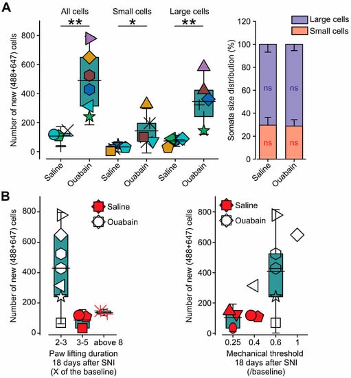 Ouabain promotes reinnervation of the denervated skin areas. (A) Left, Box plots and individual values of the total number of L3-6 DRG somata labeled with AF488 or AF647; a number of small cells and number of large cells labeled with AF488 or AF647, 18 days after SNI in animals treated with ouabain and saline. ** p < 0.01; * p < 0.05; ns—not significant, Student t-test. Box plots presented in the figures depict mean; 25th; 75th percentile and SD. Right, bar graph depicting the distribution (in %) of large (lilac) and small (pink) DRG neurons labeled with AF488 or AF647, 30 days after SNI in animals treated with ouabain and saline (shown in A, left), ns—not significant, comparisons are between the number of cells in animals treated by ouabain and saline. (B) Box plots and individual values of the number of DRG somata labeled with AF488 or AF647 in the DRGs extirpated from rats treated with either saline (red symbols) or ouabain (white symbols) 18 days after SNI and plotted according to the level of mechanical hyperalgesia (measured as the duration of paw lifting following pinprick and presented as fold change from the baseline value, left) and mechanical allodynia (measured as VF mechanical threshold and normalized to the baseline value, right). Box plots presented in the figures depict mean; 25th; 75th percentile and SD.