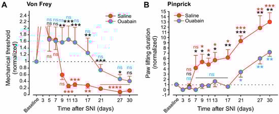 Ouabain diminished neuropathic pain. (A,B). Changes of the response to VF (A) and pinprick (B) at the indicated times following SNI in animals treated with ouabain (blue circles) and saline (red circles). The baseline value represents the mean value of the 3 tests performed at three consecutive days before SNI or sham surgery. All of the values were normalized to the baseline value. The dotted line indicated the baseline values. Black letters and asterisk—two-way RM ANOVA with posthoc Bonferroni comparison between saline and ouabain groups; blue letters and asterisk - one-way RM ANOVA with posthoc Bonferroni comparison between baseline values and values at different time points in the ouabain group; red letters and asterisk—one-way RM ANOVA with posthoc Bonferroni comparison between baseline value and values at different time points in the saline group. *** p < 0.001; ** p < 0.01; * p < 0.05; ns—not significant, n = 6 rats in each group.