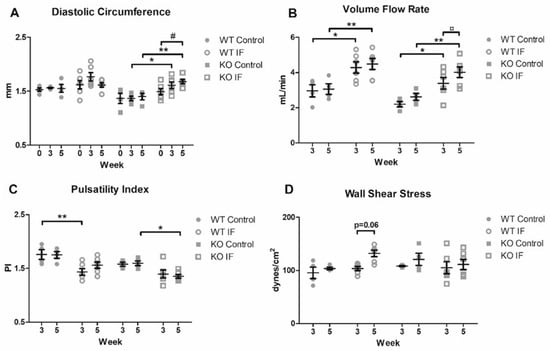 Comparison of PI revealed a significant decrease 5 weeks after surgery in the Pcsk6 KO mice exposed to increased blood flow. In the WT IF mice, an initial decrease in PI at 3 weeks after surgery was seen. However, due to an increase in PI over time, no statistical difference could be observed at 5 weeks after surgery (Figure 1C). Further analysis revealed a reduction in RI at 3 and 5 weeks after ligation in the WT mice and at 5 weeks in the KO mice (Table 1). Analysis of right carotid WSS could not detect any significant differences between IF or control groups. However, a borderline significant increase in WSS from 3 to 5 weeks (from 104 ± 3.9 to 132 ± 6.2 dynes/cm2, p = 0.063) was seen in the WT IF mice (Figure 1D).
