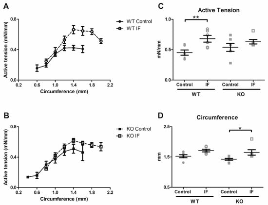 Comparison of baseline characteristics between WT and KO mice was performed in order to evaluate the presence of strain-dependent differences, which could potentially interfere with further analysis. A borderline significant decrease in bodyweight of the KO mice with a concomitant significant reduction in diastolic circumference, assessed by ultrasound (Table S1), was detected. Due to these differences, further analyses in this study were focused on comparing strain-specific controls while between-strain comparisons are given in the Supplementary Materials.