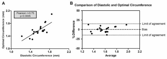 In order to investigate the influence of Pcsk6 ablation on tensile and contractile characteristics in flow-mediated vascular remodeling (Figure 2A,B) we utilized wire myography. An increased optimal circumference was observed in the KO IF mice (Figure 2A,C). Furthermore, an increased active tension at optimal circumference was detected in the WT IF mice (Figure 2B,D). However, no statistical difference in passive tension at optimal circumference was observed (Table 2). No significant difference in contractile response to phenylephrine in relation to KCl between IF and controls could be observed (data not shown). No difference in length-force curves could be detected between WT and KO mice (data not shown) and no significant effect of IF on thoracic aorta could be identified (Table 2). Of interest, comparison of lumen circumference estimated by myography and UBM revealed a significant correlation and an agreement using the Bland–Altman method of comparison between optimal and diastolic circumference (Figure 3).
