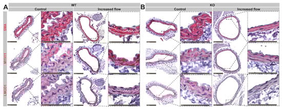 The influence of PCSK6 deficiency on the expression of typical smooth muscle cell markers upon increased flow in the right common carotid artery. Representative images of the carotid arteries stained for smooth muscle alpha-actin (SMA), myosin heavy chain 11 (MYH11) and leiomodin-1 (LMOD1) from (A) WT and (B) KO mice under normal (WT n = 2, KO n = 4) and increased flow conditions (WT n = 4, KO n = 4). KO = Pcsk6−/− mice. WT = C57Bl/6J mice.