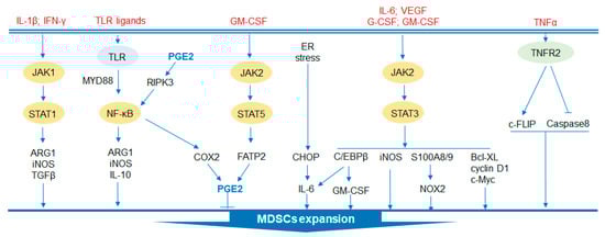 Signal transducer and activator of transcription (STAT), phosphorylated by the Janus activated kinase (JAK) family, is considered to play a critical role in the expansion of MDSCs [19]. STAT3, which has been extensively studied, prevents the apoptosis of MDSCs and promotes the expansion of MDSCs by mediating the expression of apoptosis inhibitors, including Bcl-XL, cyclin D and c-Myc [20,21,22]. In addition, activation of STAT3 drives the production of the calcium-binding protein S100A8/9, which is an inflammatory protein, and increases the accumulation of MDSCs by limiting dendritic cell (DC) differentiation [23]. Arginase 1 (ARG1) is also a downstream target of STAT3 in circulating and infiltrating MDSCs [24]. Similarly, NADPH oxidase 2 (NOX2), induced by STAT3 in MDSCs, generates reactive oxygen species (ROS) that can prevent DC differentiation [25]. Interleukin (IL)-1β and interferon gamma (IFNγ) activate STAT1 to produce ARG1 and inducible nitric oxide synthase (iNOS) and suppressive cytokines such as TGFβ to play a role in promoting tumor growth [26,27]. In contrast, a study showed that mice with STAT1 deficiency in breast cancer were more likely to have infiltration of PMN-MDSCs and tumor growth, which was rescued by anti-IL-17 treatment [28]. Therefore, STAT1 may have opposite effects on MDSCs under different conditions. In addition, a recent study indicated that STAT5, which is stimulated by GM-CSF, upregulates the expression of fatty acid transport protein 2 (FATP2) and exerts suppressive activity through the synthesis of prostaglandin E (PGE) [29].