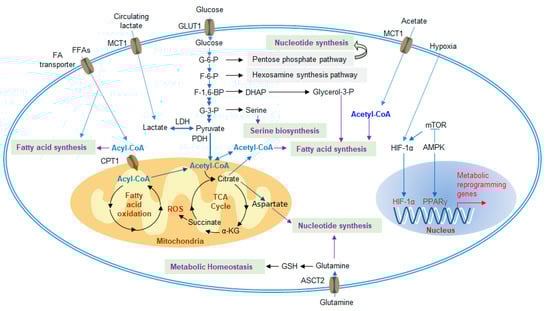 Metabolic regulatory pathways of MDSCs in the TME. Under hypoxic conditions, metabolic genes are upregulated, and increased metabolism enhances the suppressive function of MDSCs. MDSCs increase the uptake of extracellular nutrients, such as glucose, FA, glutamine and acetate, which are required for glycolysis, the TCA cycle, FAO, fatty acid synthesis and amino acid synthesis. Furthermore, excessive lactate, generated by tumor cells, can also be transported into MDSCs to participate in metabolism. FA, fatty acid; TCA cycle, tricarboxylic acid cycle; FAO, fatty acid oxidation; FFAs, free fatty acids; MCT1, monocarboxylate transporter 1; GLUT1, glucose transporter 1; G-6-P, glucose-6-phosphate; F-6-P, fructose-6-phosphate; F-1,6-P, fructose-1,6-bisphosphate; G-3-P, glyceraldehyde-3-phosphate; LDH, lactate dehydrogenase; PDH, pyruvate dehydrogenase; DHAP, dihydroxyacetone phosphate; CPT1, carnitine palmitoyltransferase 1; α-KG, alpha-ketoglutarate; mTOR, mammalian target of rapamycin; HIF-1α, hypoxia-inducible factor 1-alpha; AMPK, AMP-activated protein kinase; PPARγ, peroxisome proliferator-activator receptors gamma; GSH, glutathione; ASCT2, alanine-serine-cysteine transporter 2.