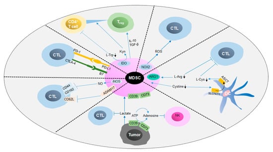 As mentioned above, MDSCs induce immune cell apoptosis and blunt anti-tumor responses by depleting amino acids, generating substantial amounts of ROS and reactive nitrogen species (RNS) and digesting ATP into ADO, thereby accelerate tumor growth (Figure 4) [56,84,88,95]. In addition, MDSCs inhibit the expression of l-selectin (CD62L) on T cells by binding with ADAM metallopeptidase domain 17 (ADAM17) on the T cell surface, resulting in an impact on lymphocyte homing [96,97]. Moreover, M-MDSCs isolated from spleen have been shown to cancel the induction of CD8+ cytotoxic T cells by CD62L, CD44, CD162 and granzyme B, which affects the binding of T cells with the extracellular matrix and selectins and leads to the suppression of T cells [98,99]. Programmed cell death-ligand 1 (PD-L1) and cytotoxic T-lymphocyte-associated protein 4 (CTLA-4) are widely identified immune checkpoints that negatively regulate the activation of T cells. Many studies have revealed that PD-L1, which is expressed on the membrane of MDSCs, interacts with programmed cell death-1 (PD-1) on T cells and induces the apoptosis of T cells [100]. Furthermore, production of Kyn and generation of IFNγ, IL-10 and TGF-β by MDSCs induces the differentiation of CD4+ naïve T cells to Tregs; however, the mechanism by which this occurs remains unclear [67,101,102]. Generally speaking, MDSCs inhibit the anti-tumor response and promote tumor development through metabolic regulation and the expression of surface molecules.