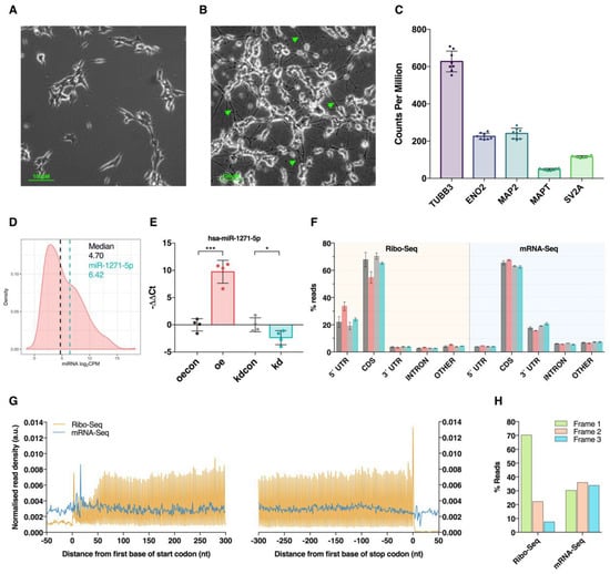Ribosome profiling of SH-SY5Y cells after miR-1271-5p differential expression. (A,B) Phase contrast images of SH-SY5Y cells prior to (A) and after (B) treatment with retinoic acid for 5 days. Note the development of neurites (green arrowheads) after differentiation. (C) Expression of known neuronal marker genes in all control cells, as detected via mRNA sequencing. Data are presented as counts per million (CPM) ± SD. (D) Distribution of log2 counts per million (CPM) values for mature miRNAs expressed in differentiated SH-SY5Y cells, as detected previously by small RNA sequencing. The vertical black line represents median CPM. The vertical blue line represents miR-1271-5p CPM. (E) qPCR validation of miR-1271-5p overexpression (red) and knockdown (blue) after lipofection with miR-1271-5p mimic or antisense inhibitor constructs, respectively. Mimic-transfected cells were compared via a negative control scrambled siRNA (black), whereas sponge-transfected cells were compared to a negative control inhibitor construct (grey). Ct values were normalised to U6 and U44 housekeeping small RNAs with the geometric mean of both used as a reference. Differential expression was calculated via Student’s t-test with significant differential regulation of miR-1271-5p observed in both mimic-transfected cells (log2fc = 9.04, p < 0.001) and inhibitor-transfected cells (log2fc = −2.18, p < 0.05). Data presented as mean −ΔΔCt ± SD. * = p < 0.05, *** = p < 0.001. (F) Genomic feature alignment rates for Ribo-Seq and mRNA-Seq libraries. Colour coding is the same as in Panel (E). (G) Metagene analysis of normalised read density around translation start (left) and stop (right) codons. Composite data are shown for Ribo-Seq and mRNA-Seq libraries, with ribosome-protected RNA fragments (RPFs) calibrated to predicted ribosome P sites. (H) Sub-codon phasing of sequencing data to each potential transcript coding sequence (CDS) reading frame revealed Ribo-Seq data that exhibits preference for the first, canonical reading frame, while mRNA-Seq data shows a relatively even spread across all three frames due to random fragmentation.