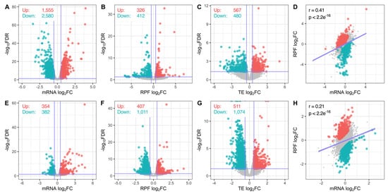 Differential expression analysis revealed miR-1271-5p overexpression significantly altered 4135 genes at the mRNA level (1555 upregulated, 2580 downregulated) and a further 738 genes (326 upregulated, 412 downregulated) at the RPF level (Figure 2A,B). When changes in RPF expression were scaled to mRNA levels by analysing translational efficiency (TE), 1047 genes (567 upregulated, 480 downregulated) were identified as significantly regulated (Figure 2C). Direct comparison of mRNA and RPF expression changes further revealed these factors were positively correlated (Pearson’s r = 0.41, p < 2.2 × 10−16), which indicated modulation of mRNA abundance and translation was generally proportional (Figure 2D).