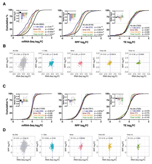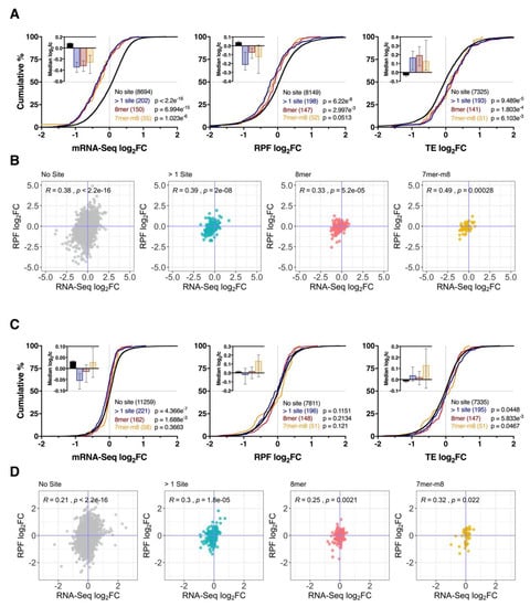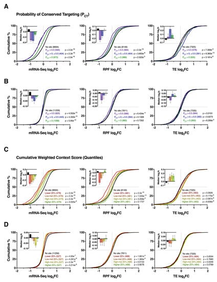 As expected, miR-1271-5p overexpression was associated with downregulation of its predicted mRNA targets (p ≤ 3.505 × 10−9) and their RPFs (p ≤ 2.522 × 10−3 for all groups, except the upper quartile of genes after stratification via CWCS) compared to genes without a predicted interaction (Figure 3A,C). Moreover, we observed a hierarchal effect on repression of targets stratified by Pct and CWCS such that genes with higher Pct and lower CWCS (i.e., more favourable binding site context) were repressed with the greatest magnitude (Figure 3A,C). Furthermore, while changes in mRNA and RPF expression were correlated for all groups (Pearson’s r ≥ 0.38, p < 2.2 × 10−16, Figure S3), RPF downregulation was slightly less pronounced, which resulted in consistently upregulated TE for most groups of target genes (Figure 3A,C). Overall, these results support the mRNA destabilisation scenario with conserved targeting and binding site context contributing to repression efficacy.