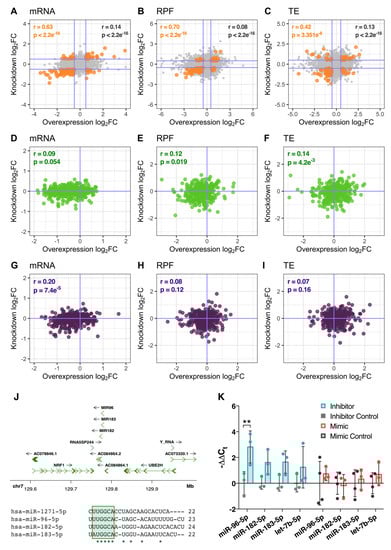Comparison of gene expression profiles between experiments and analysis of miRNAs with a similar seed sequence. (A–C) Scatter plots comparing mRNA (A), RPF (B), and TE (C) log2 fold changes between overexpression and knockdown conditions. Genes significantly regulated in both conditions are marked in orange. All other genes are coloured grey. (D–I) As in (A–C), except examining the expression of genes with only 3′UTR (D–F) or CDS (G–I) miR-1271-5p binding sites. (J) Genomic context of the miR-96/183/182 polycistronic miRNA cluster and multiple sequence alignment versus miR-1271-5p. Note the similar seed regions, shaded in green. Asterisks denote bases conserved amongst all 4 miRNAs. (K) qPCR analysis of miR-96-5p, miR-182-5p, and miR-183-5p expression levels after miR-1271-5p knockdown and overexpression. let-7b-5p was also included to ensure any changes in the miR-196/183/182 cluster were not due to global rises in miRNA processing. Data presented as mean −ΔΔCt ± SD. Expression was compared to control cells via Student’s t-test with post-hoc correction for multiple testing using Benjamini, Krieger, and the Yekutieli method. FDR < 0.05 was considered significant (** = FDR < 0.01).