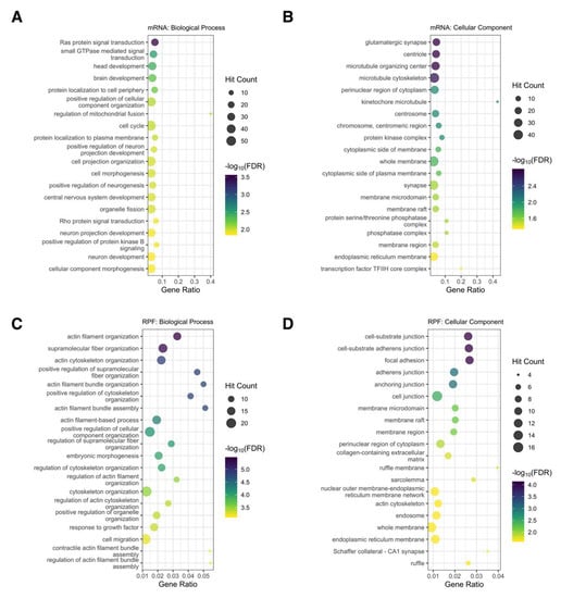 Functional analysis of directly targeted genes. (A) Top 20 significantly enriched biological process gene ontology terms after analysing target genes significantly downregulated at the mRNA level in the overexpression experiment. Note that the gene ratio refers to the overlap between the number of genes in the query versus the number of genes in the gene ontology term. (B) As in (A), except for depicting the top 20 cellular component gene ontologies. (C,D) As in (A,B), except after analysing target genes significantly downregulated at the RPF level.