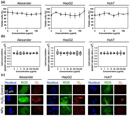 Assessment of the nanoparticle uptake and biocompatibility in three distinct hepatic cell lines. (a) Cytotoxicity of nanoparticles in three distinct cell lines: Alexander, HepG2, Huh7. Cytotoxicity was assessed using alamarBlue assay. Data are expressed as means ± SEM (n = 4). (b) Detection of lipid peroxidation using BODIPY™ 581/591 C11 lipid peroxidation sensor (ThermoFisher Scientific). Data are expressed as means ± SEM (n = 3). (c) NP treatment did not induce intracellular ROS/Superoxide (O2−) production and different subcellular accumulation. Cells were treated for 24 h with nanoparticles 50 μg Fe mL−1. NP-treated cells were stained with ROS/Superoxide Detection Assay Kit and imaged by confocal microscopy. Representative images out of three independent experiments are shown. Positive control 1 mM H2O2 for 30 min was used.