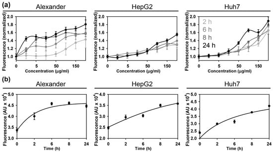 Assessment of the nanoparticle uptake in three distinct hepatic cell lines. Assessment of the uptake kinetics of fluorescently labeled nanoparticles by Huh7, HepG2 and Alexander cells. The fluorescence intensity increase upon nanoparticle treatment was detected by a fluorescent microplate reader. (a) depicts concentration-dependent uptake kinetics. (b) shows time-dependent uptake kinetics, when cells were treated with NPs 100 μg Fe mL−1 for indicated periods of time. The data are expressed as mean ± SEM, n = 4 each.