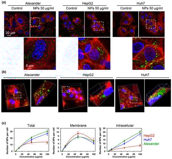 Additionally, we quantified NP number adsorbed to the membrane and ingested by the cells (Figure 3c). This quantification confirmed dose-dependent nanoparticle uptake in all three cell lines (Figure 3c). Indeed, HepG2 showed less capability for NP internalization comparing with Alexander and Huh7 cells (Figure 3c). It is worth noting here that we did not find any observable changes in overall shape or size of the cells upon NP uptake in comparison with control (Figure 3a).