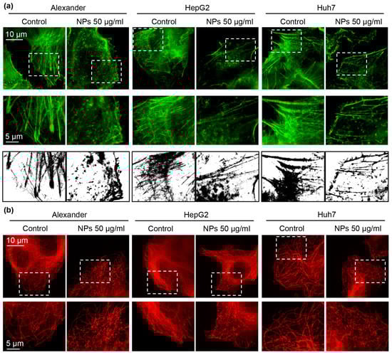 Recent studies have shown that NPs may induce cytoskeletal remodeling without oxidative stress involvement [17,60,61]. Thus, we checked whether treatment with NPs for 24 h results in cytoskeletal changes. Indeed, already conventional confocal microscopy revealed substantial re-organization of F-actin and tubulin (Supplementary Figure S4). To clearly see the cytoskeletal remodeling under higher resolution, we utilized novel super-resolution spinning disk microscopy. This type of microscopy is quite similar to structured illumination microscopy and reaches a spatial resolution of 120 nm [62]. Super-resolution imaging confirmed F-actin and tubulin remodeling under NP treatment in all three cell lines (Figure 4a,b).