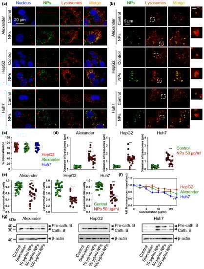 Confocal microscopy study revealed lysosomal localization of NPs after the treatment (Figure 5a,c and Supplementary Figure S5). Moreover, accumulation of NPs in lysosomes led to lysosomal size and shape alterations (Figure 5b,d,e). Upon NP treatment, lysosomes in all three cell lines increased their size significantly (Figure 5b,d). Additionally, the circular shape of lysosomes under NP treatment changed to more irregular one (Figure 5b,e). Importantly, those alterations in lysosomal size and shape were very similar in all three cell lines. However, when we checked lysosomal acidification utilizing the acridine orange lysosomal integrity assay, lysosomal activity was significantly impaired in Alexander and Huh7 cells (Figure 5f). Indeed, lysosomal acidification impairment caused by NPs was most profound in Huh7 cells (Figure 5f). Importantly, the observed NP-impaired lysosomal activity was mild and did not result in strong lysosomal damage as compared to positive control treatment (Supplementary Figure S6). In fact, it is well known that strong lysosomal damage decreases of the autophagic flux [68,69,70], whereas mild lysosomal impairment promotes autophagy as a surviving mechanism [71]. This is exactly what we observed in Huh7 cells upon NP treatment.