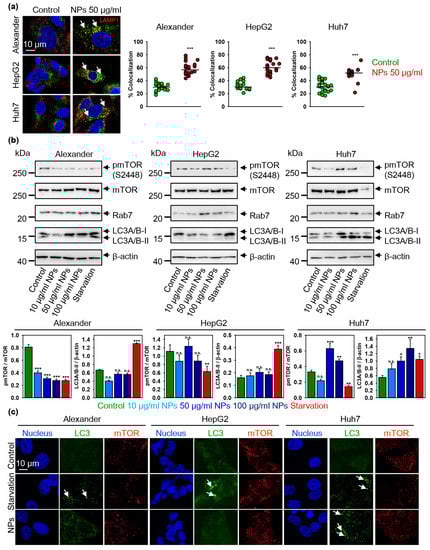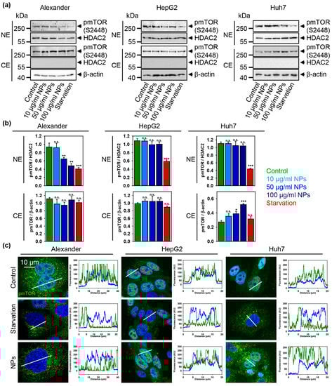 A number of studies clearly indicate that NPs modulate mTOR activity [18,81,82]. Still, the precise molecular mechanisms of mTOR signaling affected by NPs are largely unknown [18]. Therefore, we further analyzed how sub-cellular distribution and activity of mTOR might be altered by NPs. Consistently with all above discussed data, we found no changes in mTOR activity neither in the nucleus nor in the cytosol of HepG2 cells treated with NPs (Figure 7a–c and Supplementary Figure S12). Interestingly, in Alexander cells NP treatment resulted in down-regulation of mTOR phosphorylation in the nucleus but not in cytosol (Figure 7a–c and Supplementary Figure S12). Contrary, Huh7 treatment with NPs led to increased mTOR activity in cytosol, whereas nuclear mTOR levels were un-changed (Figure 7a–c and Supplementary Figure S12). As a matter of fact, classical mTOR signaling is determined at the lysosomes, where mTORC1 is phosphorylated at the lysosomal surface [25,26,27]. Of note, a number of studies showed that phosphorylated mTOR can be found in nucleus [83,84,85,86,87,88], but the exact role of mTOR in the nucleus remains enigmatic [84,87]. Indeed, increased mTOR nuclear localization has been associated with poor prognosis in patients with different types of cancer [86,89].