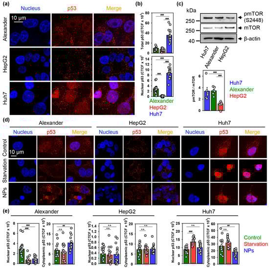 Nanoparticles affect p53 nuclear shuttling. (a,b) Representative confocal microscopic images and quantification of p53 sub-cellular localization in distinct cell lines. Huh7, HepG2 and Alexander cells were fixed and immunostained for p53 (red). Nuclei were stained with Hoechst 33342. Labeled cells were then imaged using spinning disk confocal microscopy (a). Quantification of p53 cellular fluorescence (b) was done by ImageJ and presented as means of n = 20 cells. (###) p < 0.001 denotes significant differences. (c) Expressions of pmTOR and mTOR were analyzed in whole cell lysates of HepG2, Huh7, Alexander cells by immunoblotting. Actin—control of equal protein loading. The graphs show densitometric quantification of pmTOR/mTOR ratio. Quantification performed using ImageJ. The data are expressed as mean ± SEM, n = 5–6. (###) p < 0.001 denotes significant differences. (d,e) Representative confocal microscopic images and quantification of p53 sub-cellular localization in distinct cell lines upon nanoparticle treatment. Cells were treated for 12 h with nanoparticles 50 μg Fe mL−1, fixed and immunostained for p53 (red). Labeled cells were then imaged using spinning disk confocal microscopy (d). Positive control—serum starvation for 12 h. Nuclei were stained with Hoechst 33342. Quantification of p53 cellular fluorescence (e) was done by ImageJ and presented as means of n = 20 cells. (##) p < 0.01 and (###) p < 0.001 denote significant differences.