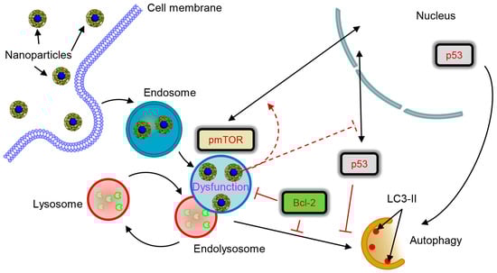 Scheme of lysosomal dysfunction upon nanoparticle treatment. Sub-lethal doses of iron oxide nanoparticles are endocytosed into lysosomes in hepatic cells within 12 h. Accumulation of nanoparticles in lysosomal compartments leads to progressive impairment of lysosomal function. The resulted lysosomal dysfunction probably affects sub-cellular localization of pmTOR and p53. Progressive lysosomal dysfunction leads to initiation of autophagic flux, which is supported by nuclear p53. Contrary cytosolic p53 and high levels of Bcl-2 inhibit autophagy.