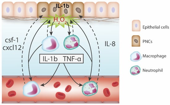 Zebrafish skin and liver cancer models showed an upregulation of the pro-inflammatory cytokines IL-1β and TNFα in response to tumour initiation [6,7,68,78,140,146]. Both of these inflammatory cytokines were important for the recruitment of leukocytes to the liver [146].