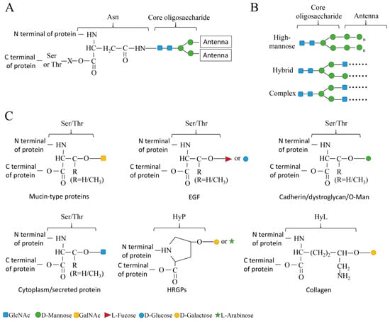 Diagram showing the structure of N-linked and O-linked glycosylation types. (A) N-linked glycoprotein. The core oligosaccharide links to the amide nitrogen of asparagine (Asn) in the consensus sequence Asn-X-Ser/Thr (Ser, Thr, and X represent the serine, threonine and random amino acids). (B) Different subtypes of N-glycoproteins. High-mannose, oligosaccharide chains linked to the core oligosaccharide via mannose; Hybrid, oligosaccharide chains linked to the core oligosaccharide via GlcNAc and mannose; Complex, oligosaccharide chains linked to the core oligosaccharide via GlcNAc. (C) O-linked glycoprotein, oligosaccharides are bonded to the hydroxyl of Ser, Thr, hydroxylysine (HyL) or hydroxyproline (HyP) of proteins. Although the O-linked glycoprotein has no core oligosaccharide, constant protein-glycans linkage was found in some types of proteins, such as GalNAc-Ser/Thr linkage found in Mucin-type proteins, l-fucose- or d-glucose- Ser/Thr linkage found in epidermal growth-factor-like repeats (EGF), d-mannose- Ser/Thr linkage found in Cadherin, dystroglycan or fungi and prokaryotes glycoproteins (Cadherin/dystroglycan/O-Man), GlcNAc- Ser/Thr linkage found in nucleocytosol glycoproteins or secreted glycoproteins in eukaryotic cells except yeast (Cytoplasm/secreted protein), d-galactose- or l-arabinose- HyP linkage found in hydroxyproline-rich glycoproteins (HRGPs) and d-galactose- HyL linkage found in Collagen.